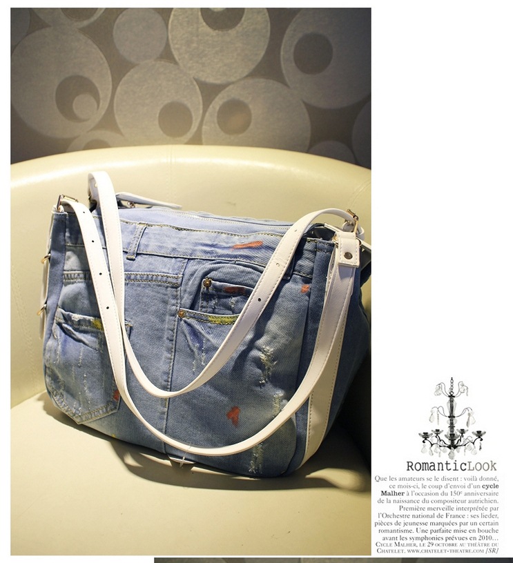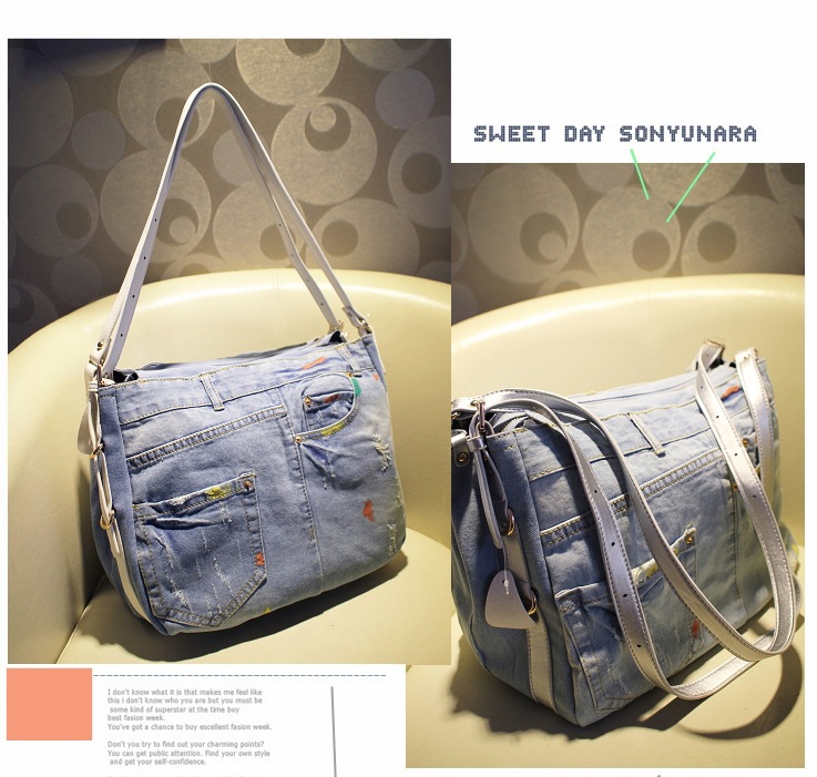 กระเป๋าแฟชั่นเกาหลี สวย คุณภาพเกินคุ้ม นำเข้าของแท้จากเจ้าของแบรนด์ค่ะ กระเป๋าทำด้วยผ้ายีนคุณภาพดี แต่งด้วยหนังสีขาวเท่มากๆ ค่ะ ภายในบุผ้าอย่างดี ขนาด 38cmx28cmx18cm ราคาปลีก 1,434 บาท ราคาส่ง 1,374 บาทค่ะ
